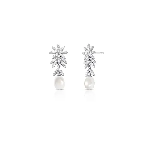 BRINCO DE FOLHA COM PÉROLA ÁGUA DOCE E ZIRCÔNIAS PRATA RODINADA