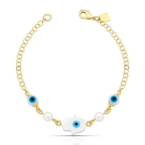 PULSEIRA MÃO DE FÁTIMA MADREPÉROLA E OLHO GREGO BANHADO A OURO
