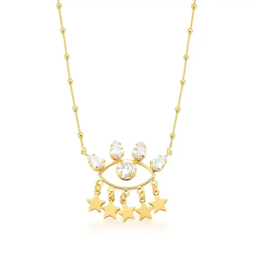 CORRENTE COM PINGENTE DE OLHO GREGO E ESTRELAS BANHADA A OURO